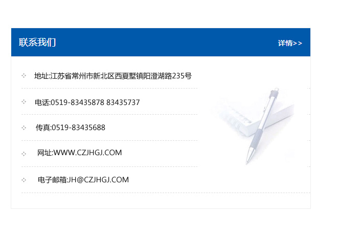地址:常州市新北區友邦商務大廈1幢16、17層  電話:0519-85101652  傳真:0519-85112595  郵編:213022  網址:www.cz-jiayue_cn.yxsyhg.com  郵箱:xiajifengaa@163.com